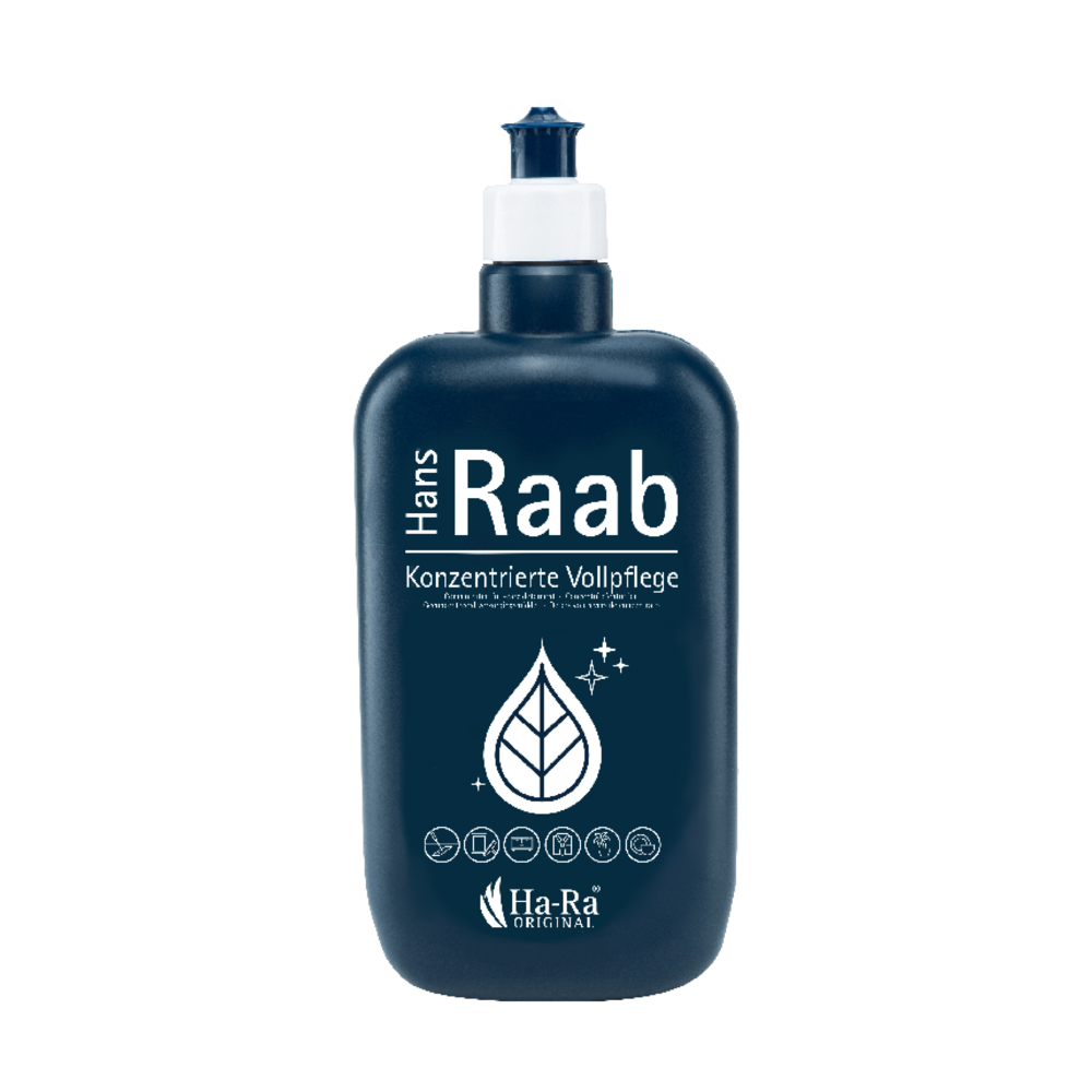 Notre nettoyant concentré Hans Raab est notre superstar, car il renforce les fibres lors du nettoyage et entretient en même temps les surfaces nettoyées.